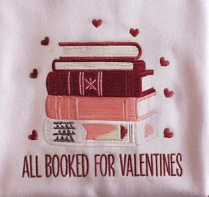 Premium Embroidery Design: Beautiful “All Booked for Valentine’s Day” embroidered lettering and book-themed motif that stands out with texture and quality — not printed flat.