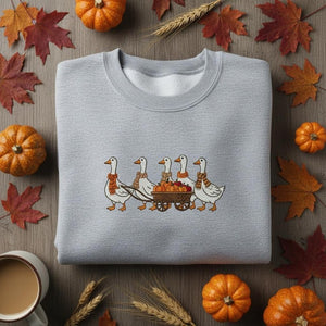 Celebrate the charm of autumn with our Autumn Geese with Pumpkin Cart Embroidered Sweatshirt โ a cozy and whimsical piece perfect for fall lovers. ๐ชถ This adorable design features geese pulling a pumpkin cart, beautifully embroidered with warm autumn tones that capture the essence of the harvest season.