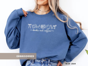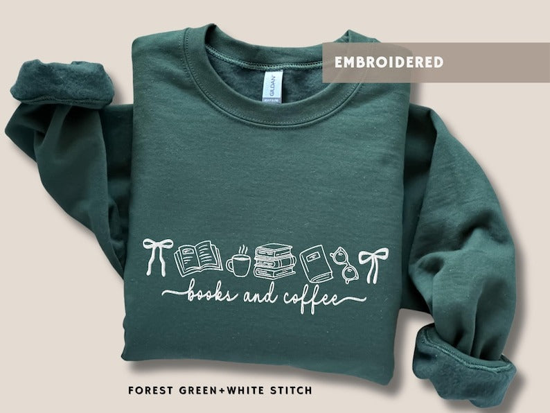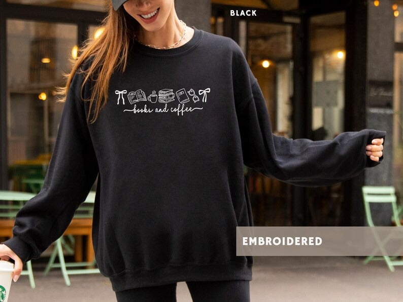 Style: embroidered crewneck with “Books & Coffee” design — aesthetic, cozy, bookish vibe