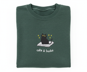 Cats & Books Embroidered Sweatshirt — Cozy Book Lover & Cat Lover Crewneck