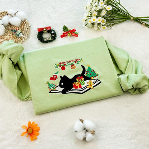 Christmas Cat Embroidered Sweatshirt, Unisex Crew Neck, Cat Lover Gift