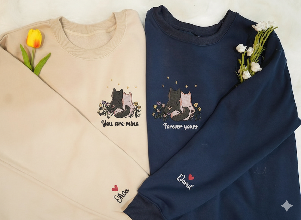 Celebrate love and companionship with this Custom Couple Cat Embroidered Sweatshirt, featuring the romantic phrase “You Are Mine / Forever Yours” paired with an adorable cat design. Created especially for cat-loving couples, this matching sweatshirt set is a heartfelt Valentine’s Day gift that symbolizes forever love and shared memories.