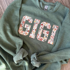 Celebrate your Gigi in style with our Custom Embroidered Gigi Sweatshirt, featuring beautiful floral appliqué chenille letters for a soft, elegant, and personalized touch. This cozy crewneck pullover is the perfect gift for grandmas, moms, or anyone who loves a sentimental and stylish look.