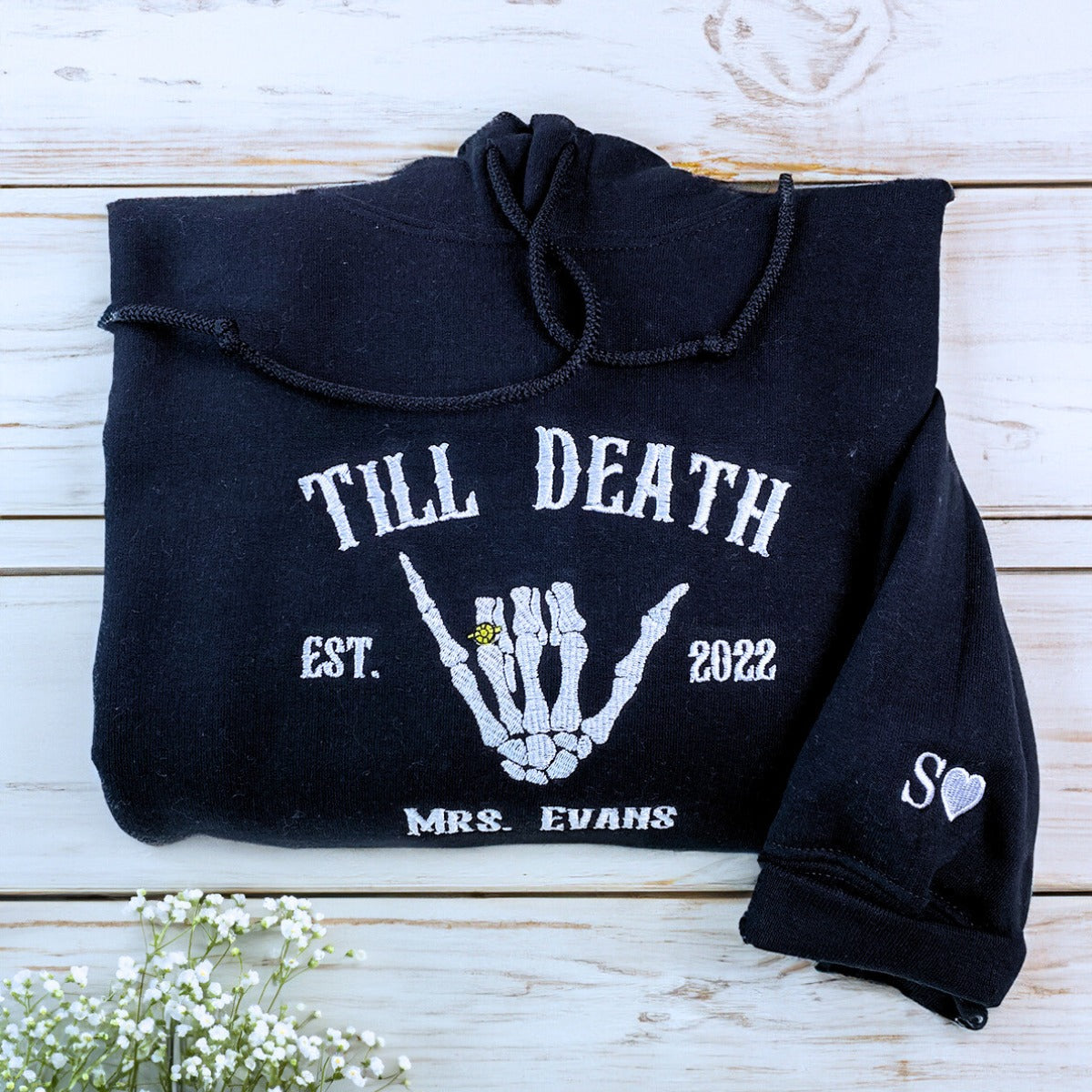 Custom Embroidered Skeleton Til Death Married Couple Mr Mrs Matching Newlywed Husband and Wife Sweatshirt or Hoodie