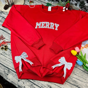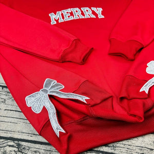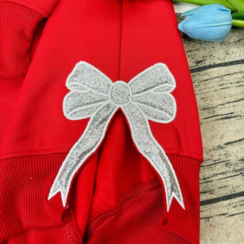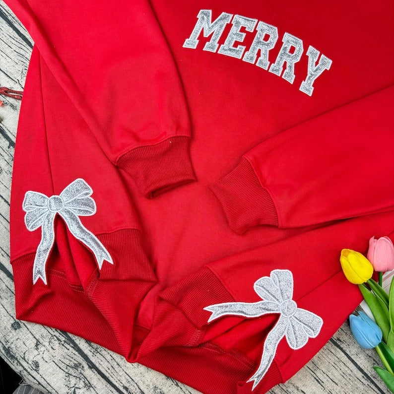 Custom Glitter Merry Christmas Sweatshirt, Red Holiday Crewneck with Silver Bow Applique, Festive Xmas Hoodie, Christmas Party Outfit Gift