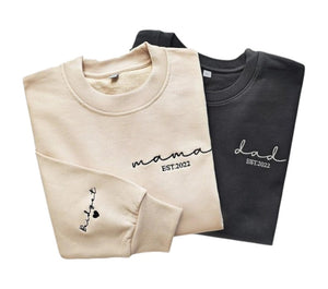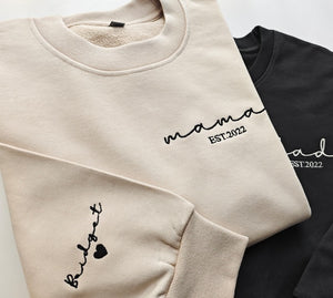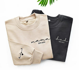 Customized Mama,Dad(Grandpa, grandma) Embroidered Sweatshirt with Date and Name on Sleeve,Gift for New Mom and Dad,Personalized Sweatshirt