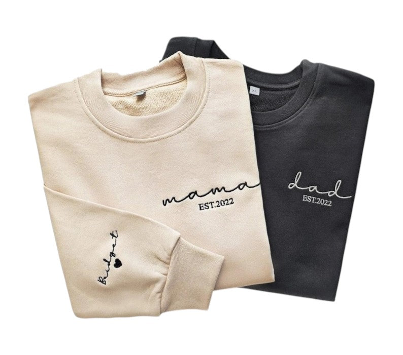 Personalized Embroidery: Customize the sweatshirt with “Mama,” “Dad,” “Grandpa,” “Grandma” (or any preferred title) and add a name and date on the sleeve — making each sweatshirt uniquely meaningful.