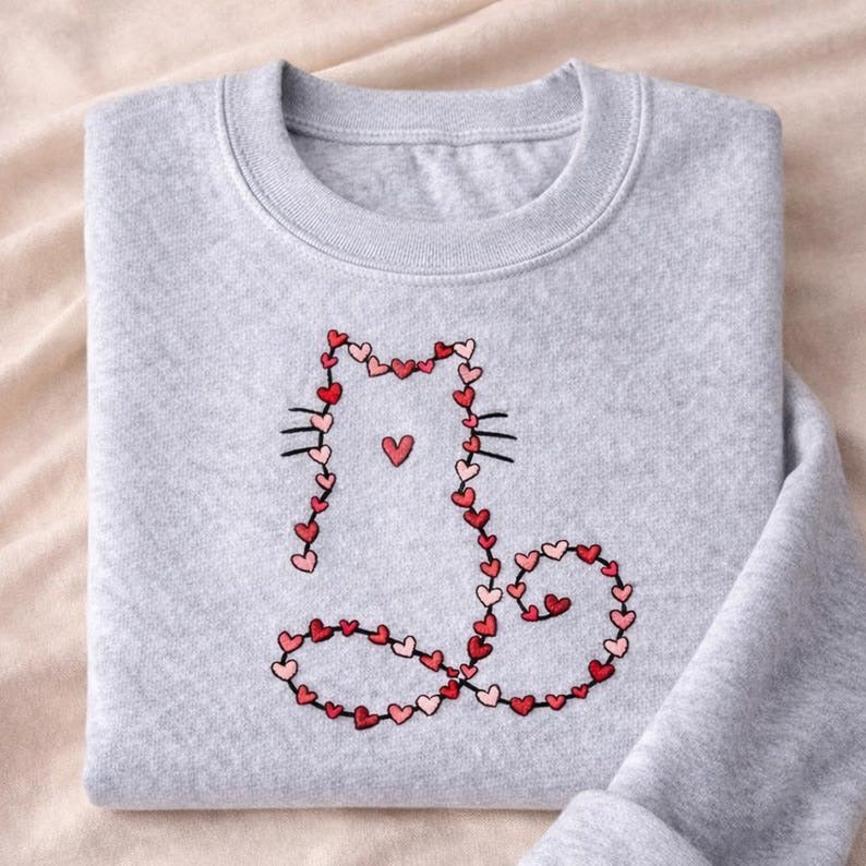 Cute Cat Hearts Valentines Embroidered Sweatshirt — Cozy Meowentine Cat Lover Crewneck