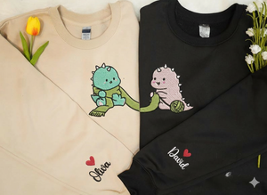 Cute Dinosaur Embroidered Sweatshirt for Couple, Matching Sweater with Custom Sleeve Name, Personalized Valentine Gift For Her, Dino Lovers