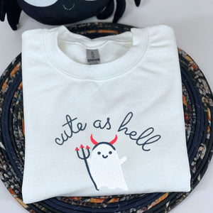 Get spooky and sassy in this Cute As Hell Embroidered Hoodie / Sweatshirt — the perfect statement piece for Halloween lovers who want to be fun and bold.