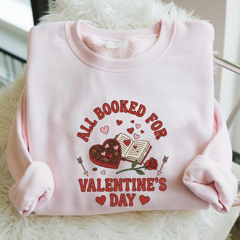 Eye-Catching Embroidery: Embroidered “All Booked For Valentines” design adds texture and charm that printed sweatshirts can’t match — a perfect look for literary enthusiasts.