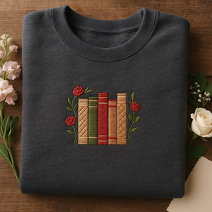 The Embroidered Book Spines Sweatshirt is a must-have for readers and literary lovers. Featuring elegant embroidered book spines adorned with red roses, this design captures a romantic library and dark academia aesthetic, perfect for cozy reading days and timeless bookish style.