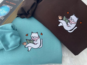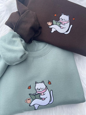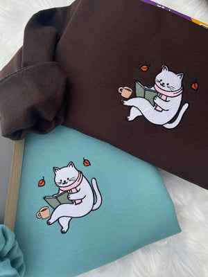 Embroidered Cat Bookish Reading Sweatshirt, Cozy Cat Reading Reading Shirt, Embroidered Book Lover Autumn Sweatshirt, Bookish Hoodie,