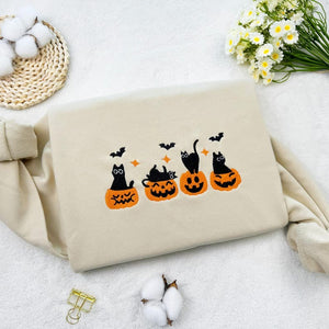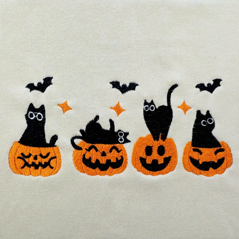 Embroidered Cat Pumpkin Halloween Sweatshirt: Unisex Cotton Crew Neck