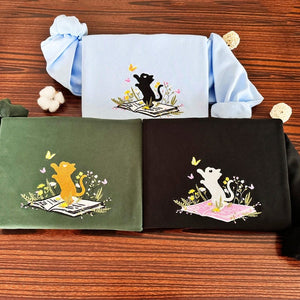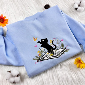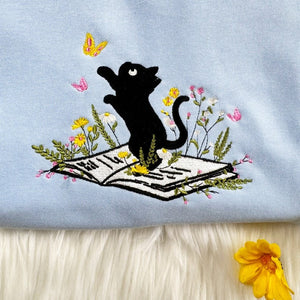Cozy up with charm and creativity in our Embroidered Cat Sweatshirt! This beautifully detailed crewneck features an elegant embroidered design of a curious cat gazing at a fluttering butterfly atop an open book — perfect for book lovers, cat enthusiasts, and anyone who adores peaceful, nature-inspired designs.