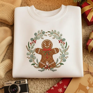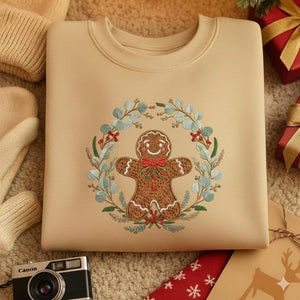 Bring holiday cheer to your wardrobe with this Embroidered Gingerbread Man Sweatshirt — a cozy and festive piece perfect for Christmas and winter fun. Featuring a detailed gingerbread man embroidery adorned with festive flowers, holly leaves, and holiday accents, this cozy sweater adds charm and joy to every outfit.