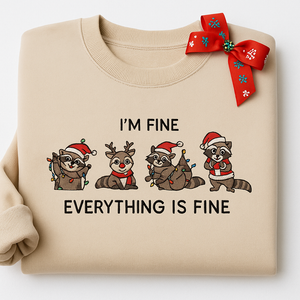 Bring holiday humor and festive vibes into your wardrobe with this hilarious “I’m Fine Everything Is Fine” Raccoon Christmas Sweatshirt — a cozy, fun, and memorable piece perfect for winter parties, holiday photos, or casual everyday wear.