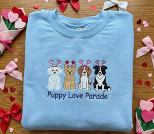 Embroidered Puppy Love Parade Sweatshirt, Dog Valentine Crewneck, Mixed Breed Dog Sweater, Puppy Lover Gift, Blue Pullover