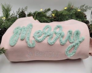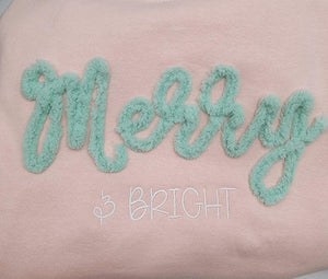 Handmade Merry & Bright Chenille Christmas Sweatshirt — Fuzzy Holiday Pullover, Custom Embroidered Christmas Sweater