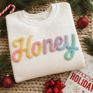 Sweet, soft, and full of love — our HONEY Chenille Yarn Embroidered Sweatshirt is the perfect cozy gift for moms, grandmas, or anyone who brightens your life. This beautiful sweatshirt features fuzzy chenille yarn embroidery spelling “HONEY” in soft, plush letters that add texture and warmth to any outfit.