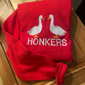 Join the funniest campus around with our Honkers Goose University Embroidered Crewneck Sweatshirt — the ultimate mix of humor, comfort, and cozy collegiate style! Featuring a detailed embroidered goose and university logo design, this crewneck is perfect for anyone who loves geese, memes, or playful streetwear.