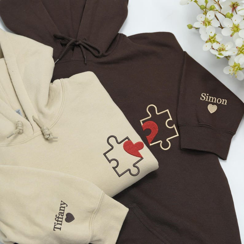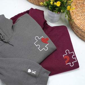 Celebrate your love story with our Matching Embroidered Puzzle Heart Couple Hoodie, thoughtfully designed for couples who fit perfectly together — just like puzzle pieces. Each hoodie features an interlocking heart and puzzle embroidery, with custom initials stitched on the sleeve for a personal and romantic touch.