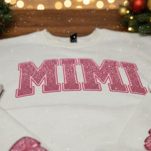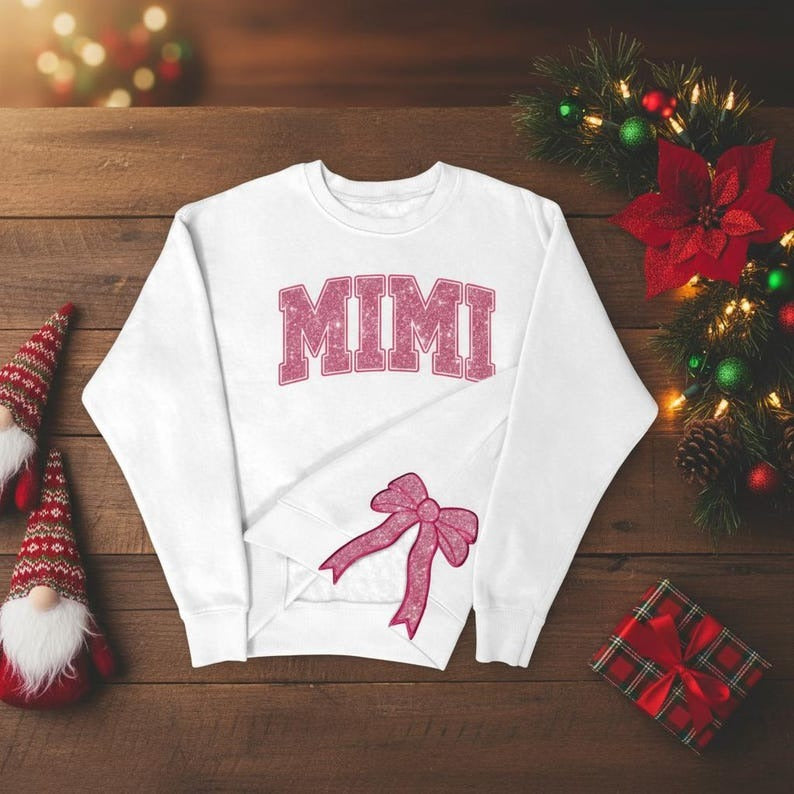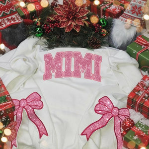 Celebrate the holidays in sweet, personalized style with our MIMI Side Bow Embroidered Sweatshirt. This festive sweatshirt features a beautiful embroidered “MIMI” design paired with a charming side bow applique, bringing a cozy and feminine touch to your Christmas wardrobe.