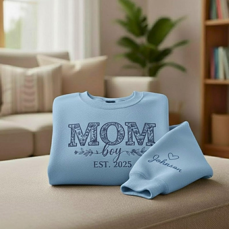 Celebrate motherhood with a personalized touch — our MOM Embroidery Sweatshirt is designed for moms who want to wear their pride and love proudly. With a custom “Boy” embroidery and “EST 2023” detail, this green sweatshirt becomes more than just clothing — it’s a meaningful keepsake embracing new beginnings and maternal love.