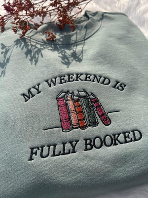 Cozy up with your next favorite read in this “My Weekend is Fully Booked” Embroidered Sweatshirt — the perfect pick for book lovers, librarians, and weekend readers alike! Featuring elegant embroidery on a soft, premium cotton-blend crewneck, this sweatshirt celebrates the joy of reading in comfort and style. Ideal for lounging at home, visiting the library, or gifting to your favorite bookworm.