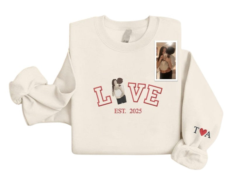 Custom Embroidered Portrait: Upload a favorite photo of you and your partner and our skilled artisans will create a detailed embroidered version of your picture right on the sweatshirt — making every stitch meaningful and unique.