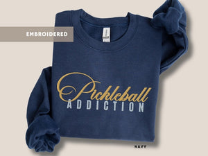 Style: embroidered crewneck/hoodie with “Pickleball Addiction” graphic — sporty & fun vibe