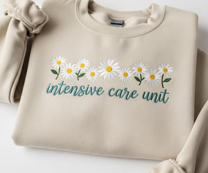✔ Design: embroidered daisy floral with ICU Nurse lettering — simple, elegant, and symbolic