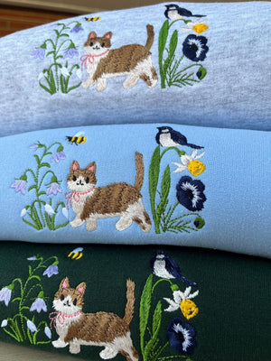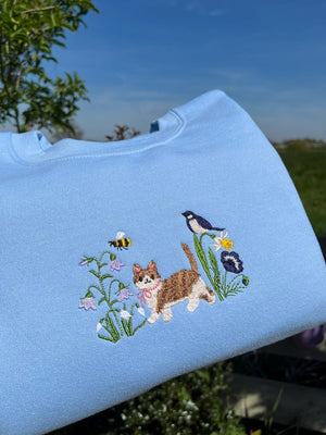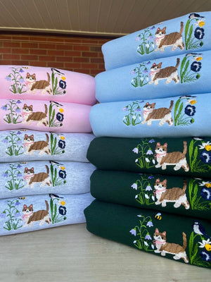 Step into spring with our Spring Cat Wildflower Meadow Sweatshirt! This adorable embroidered crewneck features a sweet cat surrounded by blooming wildflowers — the perfect mix of cozy comfort and cottagecore charm.