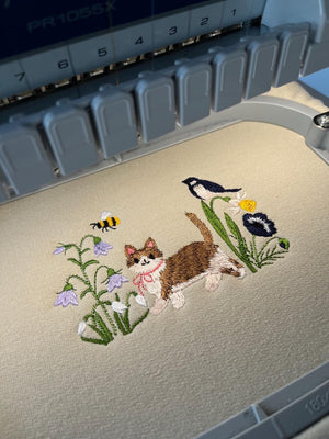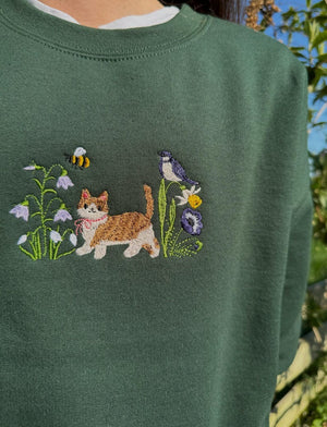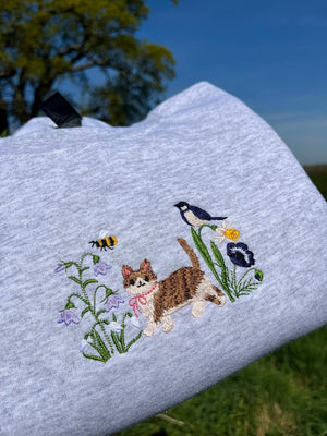 High-quality embroidered cat & wildflower design