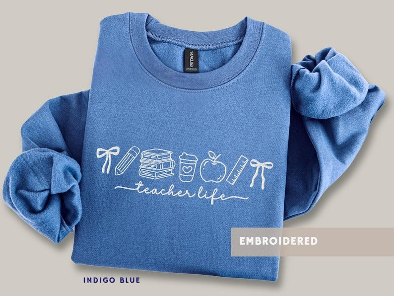 Style: crewneck sweatshirt with embroidered doodle-style teacher-themed graphic
